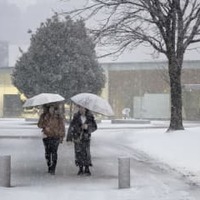 雪が降る金沢市内を歩く人たち=13日午後4時43分