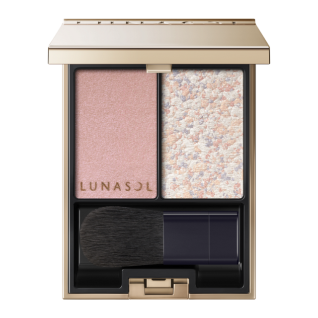 鮮やかなブラッシュカラーと光を放つイルミネイティングカラーの2色セット。頬に透けるような血色感と、光の彩りが揺らめくような立体感を演出し、表情に余韻のある印象美を与えてくれる。