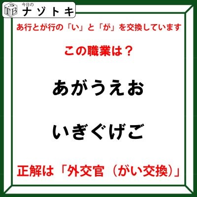 よって、「が」と「い」が交換、がといがこうかん、がいこうかん、そう「がいこうかん(外交官)」です!