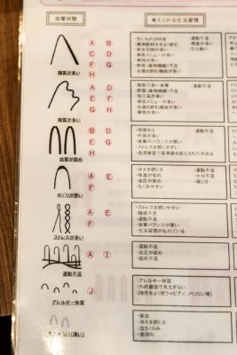 このコースが非常によいのは、最終的に自分にはどのような弱点があり、生活習慣の改善でどうアプローチできるかという具体的な対策までセットで相談に乗ってもらえる点。サプリは3Fのショップで直接購入可能ですので、定期的に通えばワンストップでチェックから対策まで身体のメンテナンスが終了します。実際、そのように利用している長年のリピート客も多いのだそう。さて、以下は私の測定結果です。