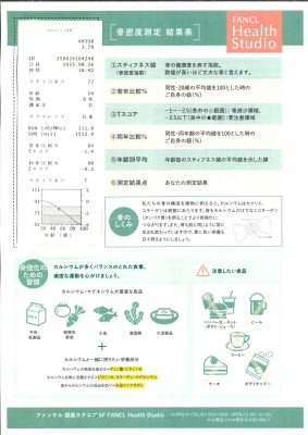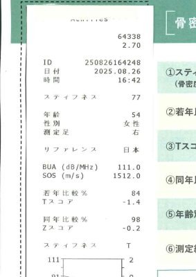これは今回の測定と関係のない医学検査のお話ですが、私は3年前に整形外科で検査を受け、大腿骨YAM値が72%と低いことから医薬品の活性型ビタミンD3の処方を受けました。ところが、1年間服用して1年後に再測定したところ、やっぱり72%。「えええ、まる1年欠かさず飲んだのに増えないんですか?」と悲鳴をあげてしまいましたが、「これでOKです。閉経前後は何もしなければ年1%ほど確実に減りますから、まずは平行に保つことが重要です」と医師に言われました。