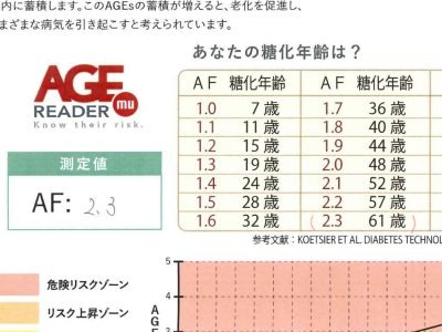 拡大です。エピクロックの数値は食事を管理すれば比較的動くそうなのですが、AGEsの値はさほど動かないとのこと。これはちょっと厳重に管理せねばですね……。