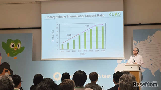 京都先端科学大学(以下、KUAS) 工学部 機械電気システム工学科・副学長の田畑修教授によるプレゼンテーション「学部学生に占める留学生比率20%を5年間で達成する戦略」では、工学部における改革について語られた。KUASは、東南アジア、ヨーロッパ、中近東、アフリカ、南北アメリカなど、世界中から積極的に学生を受け入れている。工学部においては全講義を英語で行う体制を敷き、低コストで場所を選ばないDETを留学生の英語能力認定に採用。留学生には入学時の日本語能力は一切問わず、英語のみで挑戦できる環境を提供することで、インドやバングラデシュ、パキスタンなどからトップクラスの優秀な学生(上位5~10%)を集めているという。