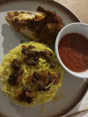 チキンマクブース 3820円 マクブースとは、鶏肉、羊肉や魚などを数種類の香辛料で味付けしたアラビア風の炊き込みご飯のこと。トマトソースもついていますが、実はご飯にかけて食べるものだそうです。