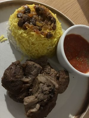 メイン料理は3タイプ。お肉料理は1つのお皿にお肉、お米、トマトソースが載って出てきます。