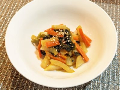 これらの“肺の機能にうれしい食材”を使ったおススメレシピの1つ目は「にんじん・梨・高菜のメープルからしみそ和え」です。秋におススメの味である“辛み”は控えめにと記載しましたが、からしはおでんを食べる時ぐらいしか登場シーンがない…とも思い、からしを使ったレシピを考案してみました。