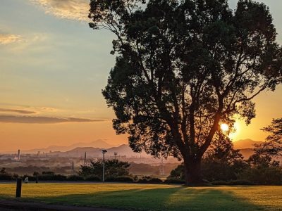 写真は真西の方角に沈む太陽です。秋分は太陽が真西に落ちていきます。再春館ヒルトップではちょうど大木の向こう側に夕陽が見える頃で、業務終了後の帰宅の途につく18時過ぎにこのような夕陽に出会うことが出来ます。秋分の夕陽を見るのは今年で19回目になります。来年も健やかに20回目を見たいと思います。