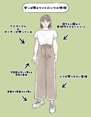 安っぽく見えるワイドパンツは、素材の厚みやウエスト周辺のふくらみ、丈や全体的なシルエットの取り方が影響しています。いずれも下半身全体が太って見えるようなデザインになっているものは、残念ながらモノが良くても安っぽく見えてしまうのです。