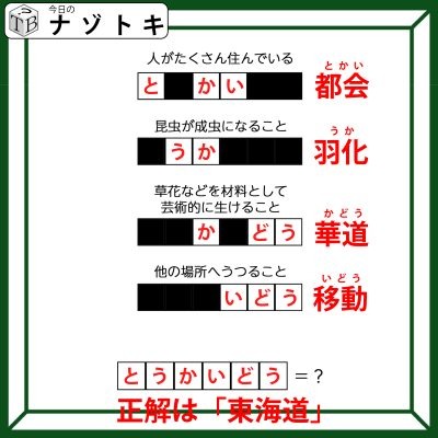 すると、上から「都会(とかい)」「羽化(うか)」「華道(かどう)」「移動(いどう)」となります。