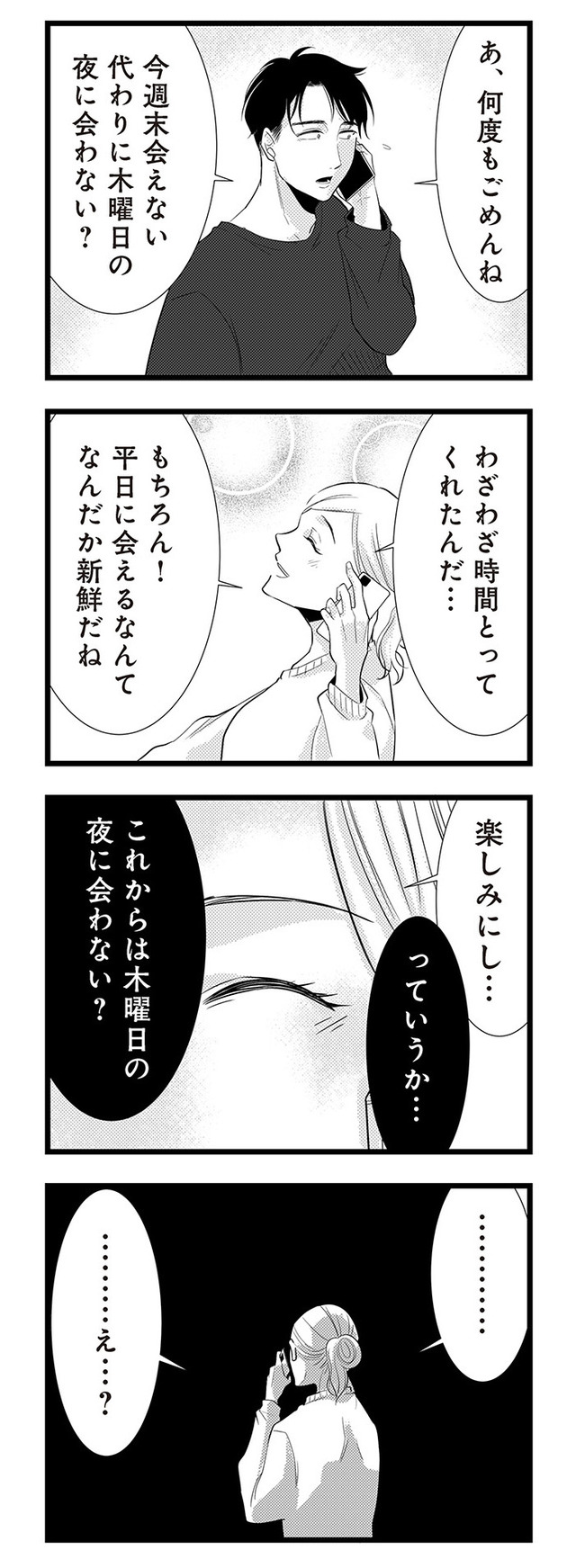 ところがある日、晃平から「これからは平日に会わない?」という謎な提案が…。胸に不安を抱えつつも彼を信じようとする春子。