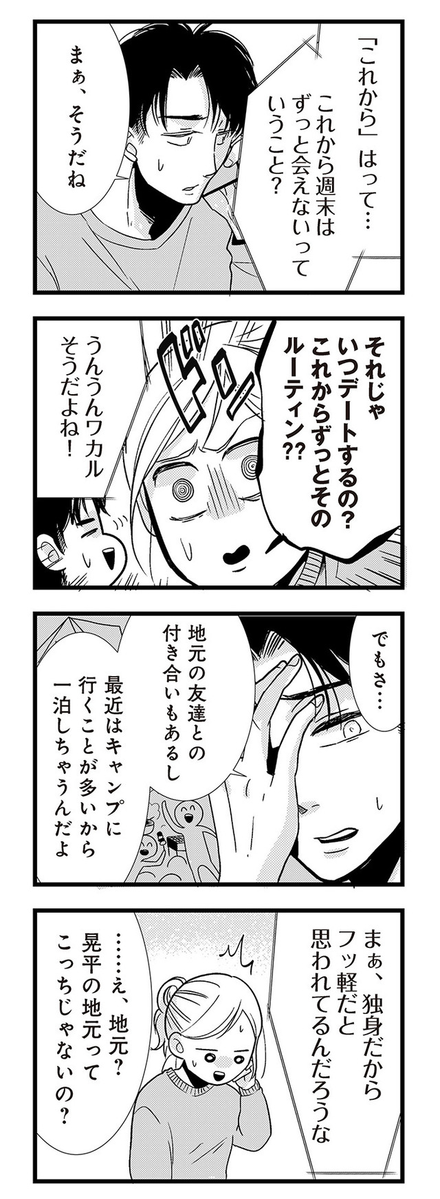 ところがある日、晃平から「これからは平日に会わない?」という謎な提案が…。胸に不安を抱えつつも彼を信じようとする春子。
