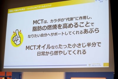 続いて、齋藤先生にマイクが移りました。齋藤先生のテーマは「MCTオイル」で、オメガ3と同様に注目すべき油です。