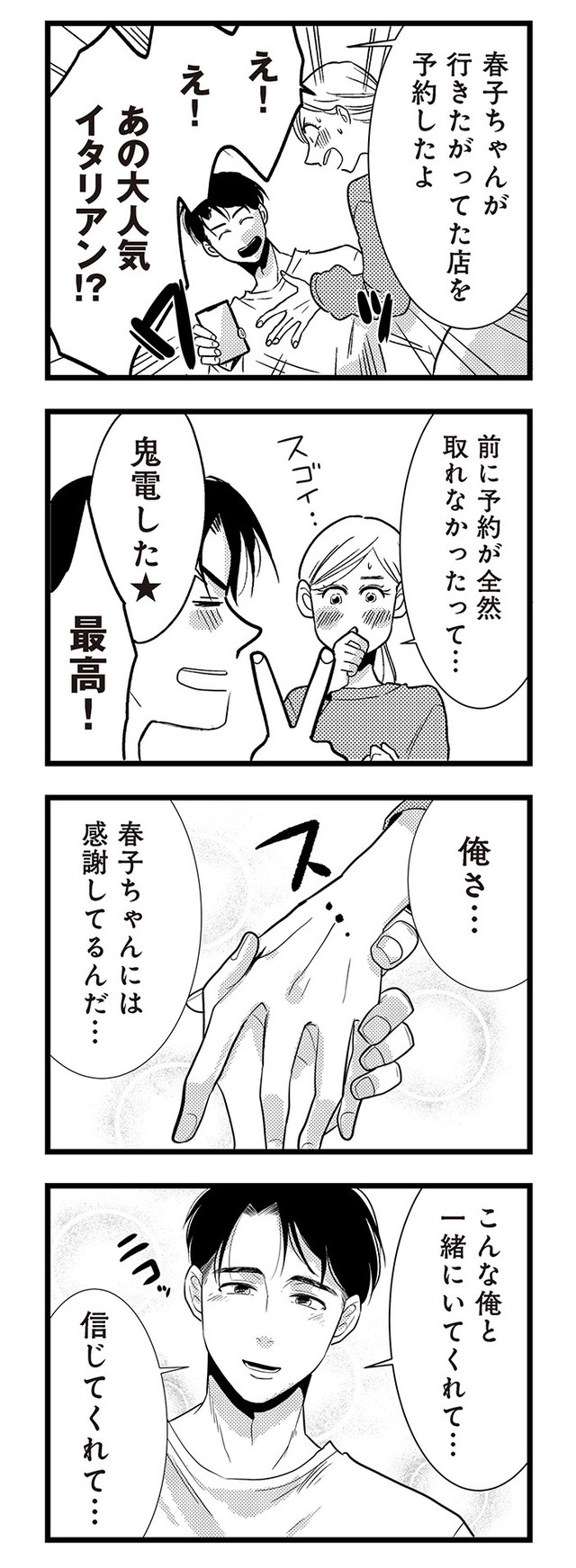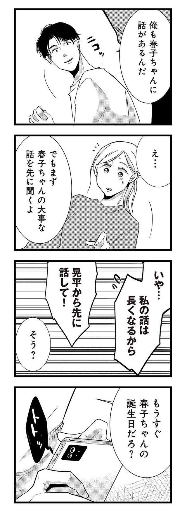 ところがある日、晃平から「これからは平日に会わない?」という謎な提案が…。胸に不安を抱えつつも彼を信じようとする春子。