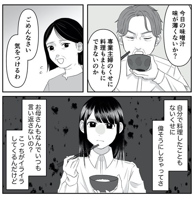 高圧的で文句ばかり言う父、父に逆らえずいつも耐えている母にうんざり…。