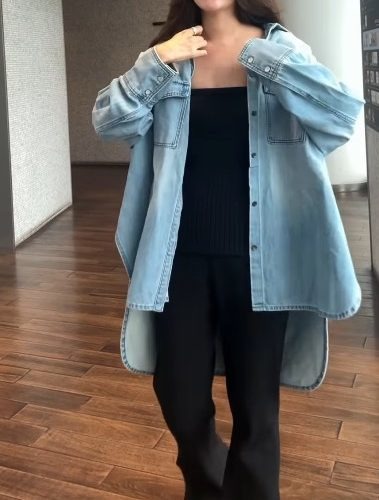 黒のフレアパンツが縦のラインを強調し、脚長効果とスタイルアップを叶えるキーアイテム。デニムジャケットのライトブルーが、全身の黒に軽やかさをプラスし、重く見せないバランスが上手な着こなしです。
