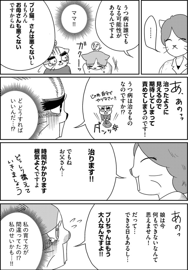 ブリ猫。父は定年間近でもバリバリ働き、娘・ブリ猫。は二人目の子供を出産したばかり。公私ともに順風満帆!……のはずだった。ある日、ブリ猫。が意識混濁で緊急搬送されたことで、初めて娘が“精神科”にかかっていること、薬を大量に飲んでOD(オーバードーズ)したことを知り……!?「何が原因?」「うつ?」「心の病気?」わからないことだらけだけど、患者とその家族が”双極性障害”を受け入れて生きていく……その半生を描いた感動の実録エッセイ!