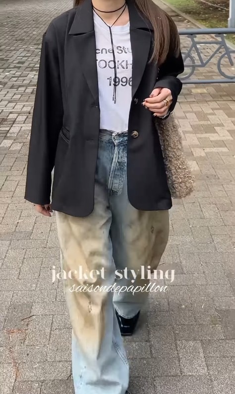 ミドル丈のテーラードジャケットを主役にした大人のカジュアルミックススタイル。きちんと感のあるジャケットに、ロゴTシャツとトレンドのタイダイ風デニムを合わせることで、きれいめな中に遊び心と抜け感をプラスしています。