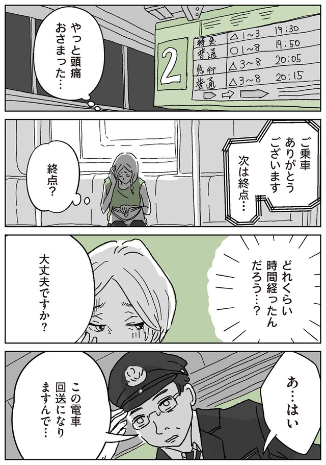 そんなある日の帰り道、電車内で激しい頭痛に襲われ、座り込んだまま終点まで行ってしまう。
