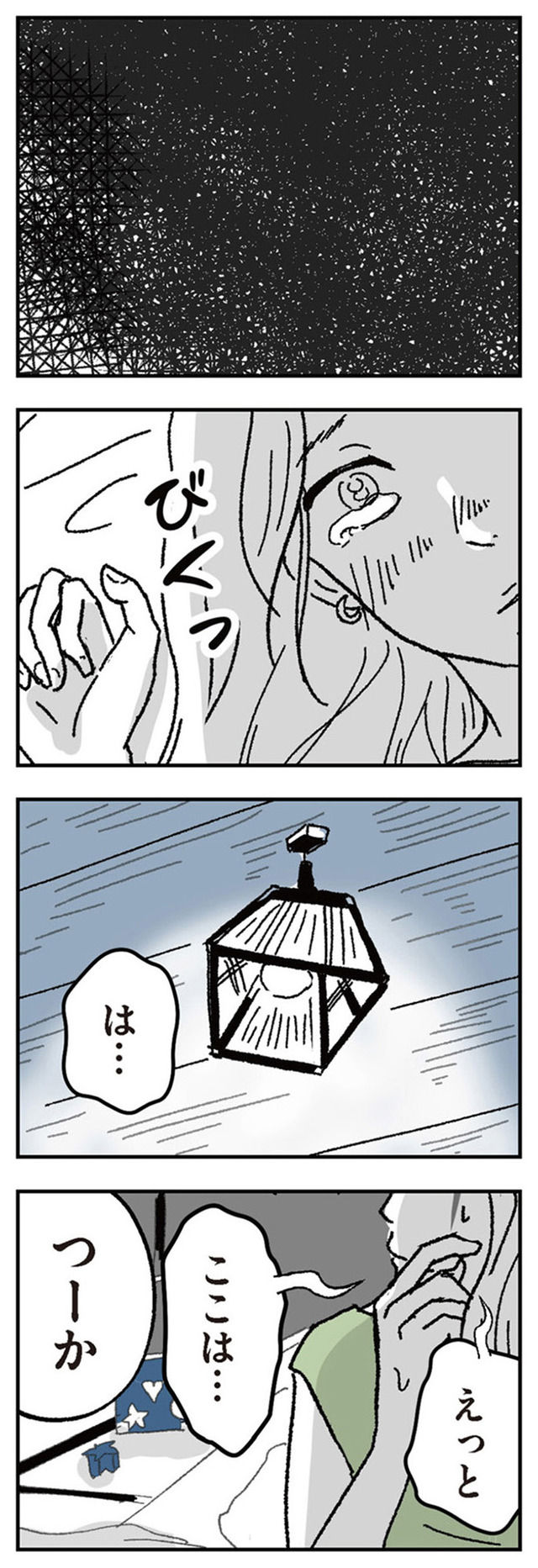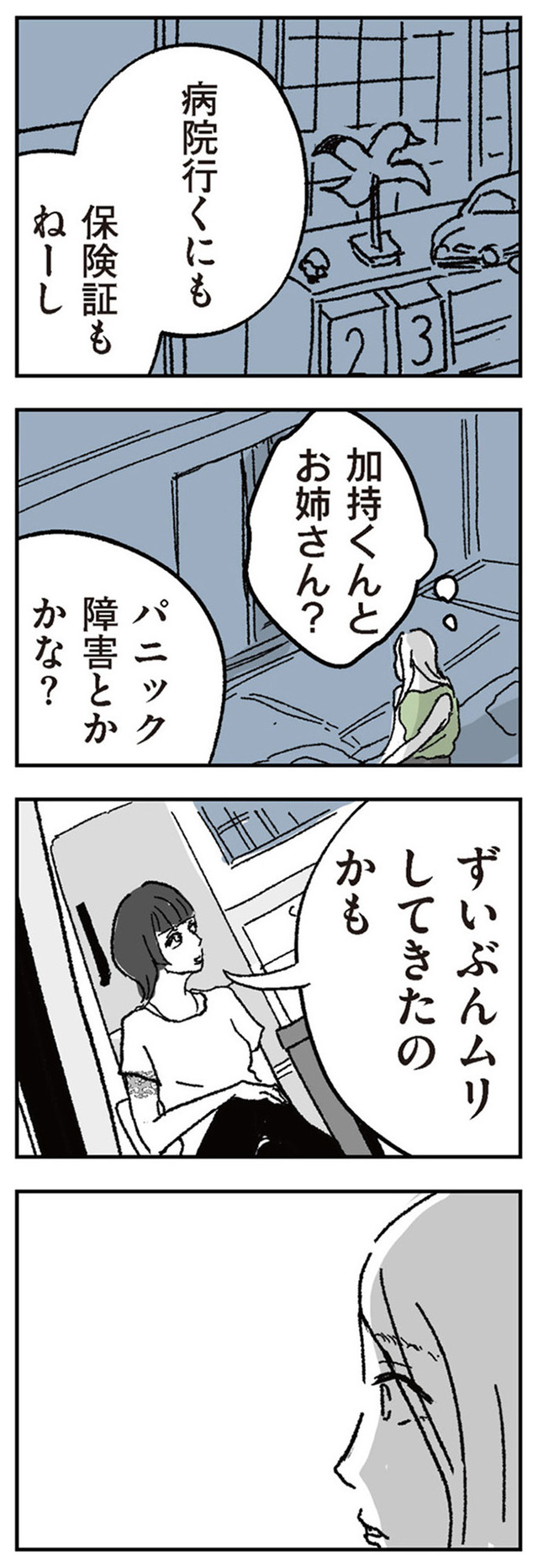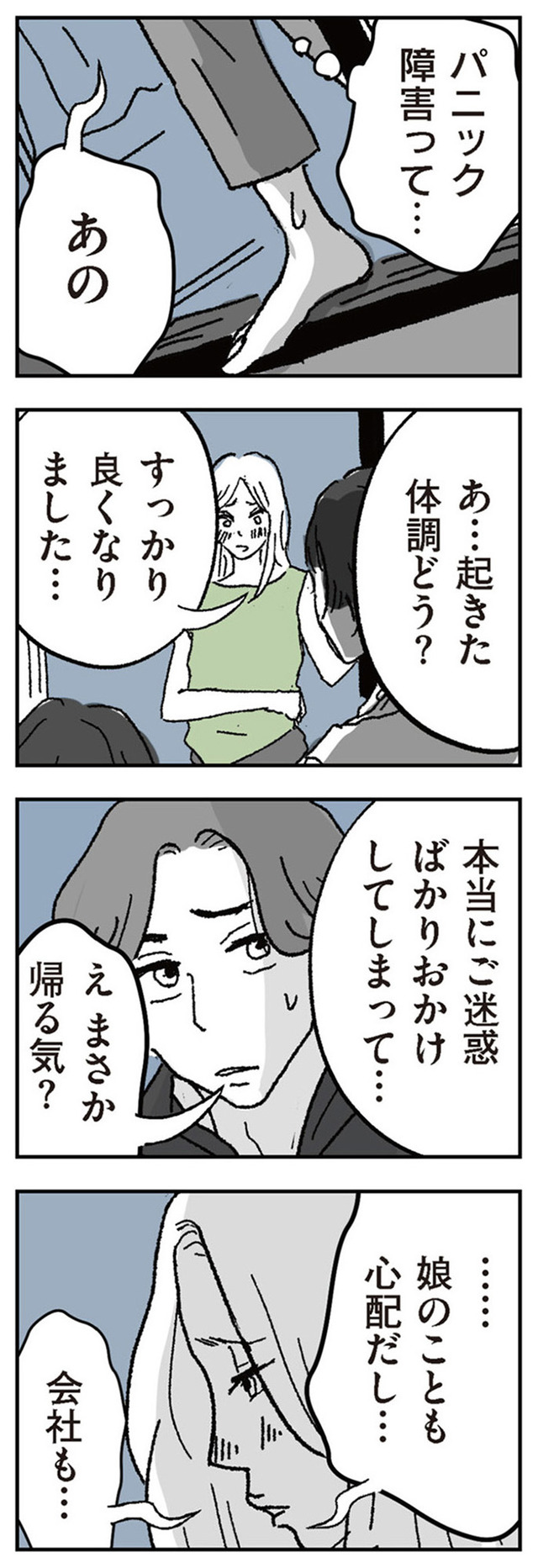 親切な青年に助けられるが、なんとか持ち直して家に帰ろうとすると、パニック状態になり「帰れない」自分に気づく。