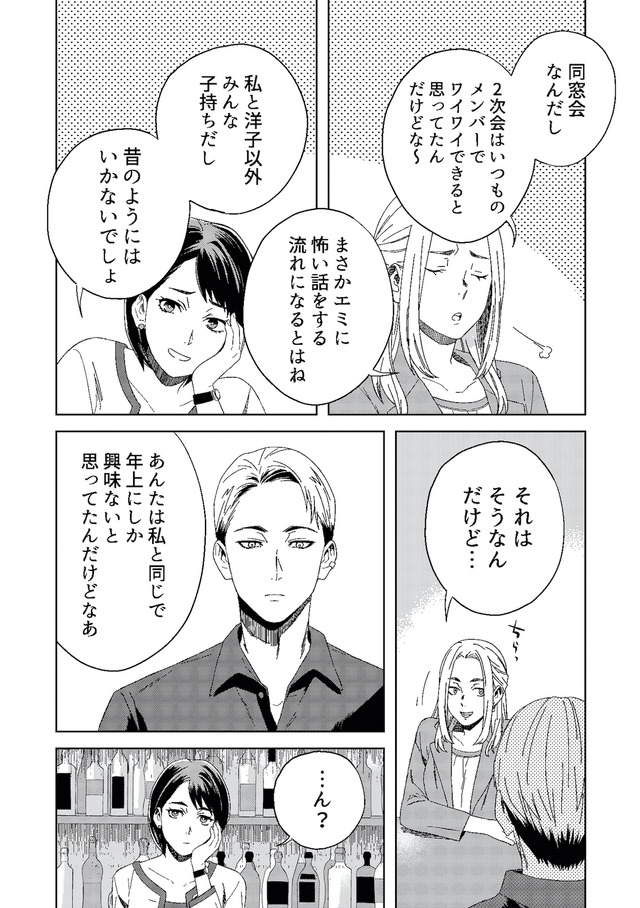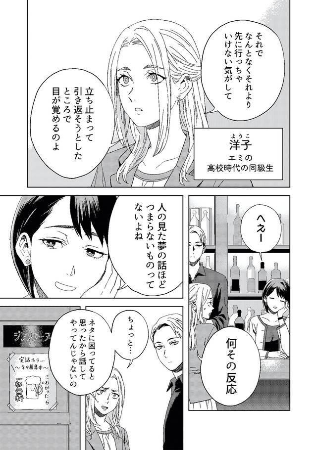 バーを営む霊感ゼロの脚本家・エミ(35歳)。ホラー系連載の締め切りを目前にした彼女は、1杯のタダ酒と引き換えに怪談の“ネタ”を求めていた。