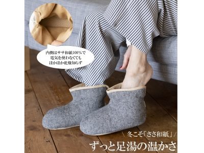 【和紙ルームブーツ】ずっと足湯のあたたかさ♪「くまざさ」を和紙にすきこんだ「ささ和紙」の糸で織った生地を内側に使用。吸湿性が高く「靴下をはくより断然あたたかい!」と評判。丸洗いOKです