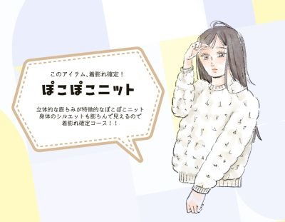 数年前にトレンド浮上してから、少しピークは落ち着いたもののよく見かける素材となりました。とくに最近は、ニットの生地表面に立体的なモチーフをあしらうデザインがとても人気なので、ポコポコニット然り、そのような特徴的なニットを取り入れる方は多い傾向にあります。