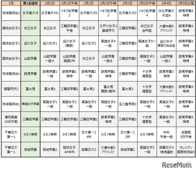 女子美大、共立女子、品川女子、山脇学園、跡見学園、富士見、実践女子、三輪田学園、かえつ有明、成城学園