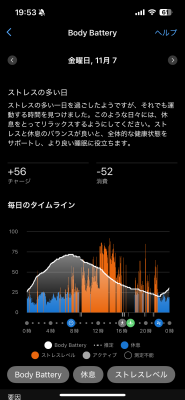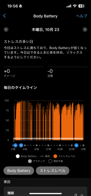 左端の0時から青い睡眠でバッテリーが回復していき、起床とともにオレンジで消費がスタート。日中の業務時はストレスが高く、夕方にピラティスをしている最中はストレスがないのですが、例えば帰宅後ごろごろしながらリラックスしてマンガを読んでいる間も脳は刺激を受けているのでオレンジになります。