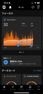 これは自分で探してダウンロードしたフェイス。シンプルでものすごく気に入っています。そもそもガーミンは民生用ポータブルGPSの草分けであるため、地図と結びついた情報管理がものすごく上手なのですが、長年に渡り先端で研究を続けているため独自アルゴリズムにも定評があり、あらゆるセンシング精度が高い。かつ、老舗であるが故にアプリでの数値表現も洗練されています。睡眠、ストレス、消費カロリー、いろいろな項目が「わかりやすく」可視化されるのです。