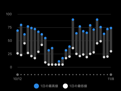 これと同様の「サイン」は他のデータでも見てとれます。また、5日目に急激にボディバッテリーの上値が改善しているのは「眠れるようになったから」だと思いますが、こうして見てみると5日隔離というのも何となく妥当性を感じます。