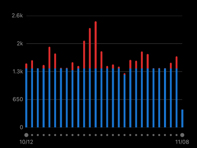 ちょっと視点を変えて、下図は1か月表示にした消費カロリーです。青い部分は安静時の消費カロリー(基礎代謝)、赤がプラスの運動などでの代謝です。