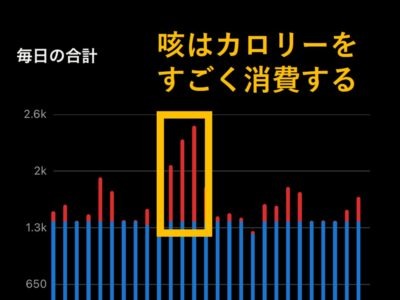 真ん中の突き出たところが特に咳の酷かった3日間です。咳ってこんなに圧倒的にカロリーを消費するんですね、その割には痩せませんでした。