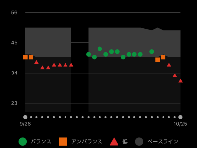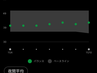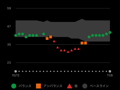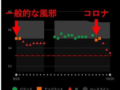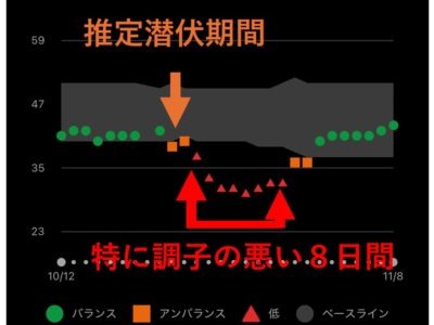 とはいえ普段はずっとグリーン(バランス)なので、私にとってはガーミン使用スタートから半年の間、いまひとつ何に使えるのかがわからないデータでした。が、たまたまですが、10月初めに「普通の風邪」にかかっていたので、今回は偶然ですが風邪の強度の比較ができました。