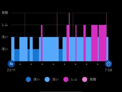 これは私の典型的な「よい」睡眠パターンです。寝入りばなに濃い青の「深い睡眠」を何度か繰り返し、やがて薄い青の「浅い睡眠」と濃いピンクの「レム睡眠」が交互に出る。途中に何度か覚醒していますが、すぐ再び寝ています。この日のスコアは86点となかなかの高得点です。なお、こうしたビジュアルが直感的にわかりやすいのもガーミンのよいところです。
