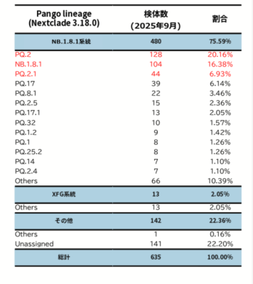 夏頃には、「まるで剃刀で喉を引き裂かれるような」と表現されたオミクロン変異株のNB.1.8.1、通称「ニンバス」が流行していました。8月の同じ集計を見るとNB.1.8.1が29.20%ですが、上図の9月にはニンバスの子孫株にあたるPQ.2(NB.1.8.1.2)に入れ替わりつつあるようです。