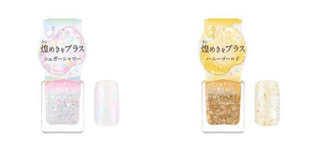 華やかさと上品さを両立したホログラム入りの2色をラインアップ。金平糖のように幻想的にきらめく「シュガーシャワー」と、はちみつのように甘美に輝く「ハニーゴールド」。どちらの色も、多種多彩なラメをたっぷりと配合し、重ねても、単色使いでも、華やかで上品に仕上げてくれる。