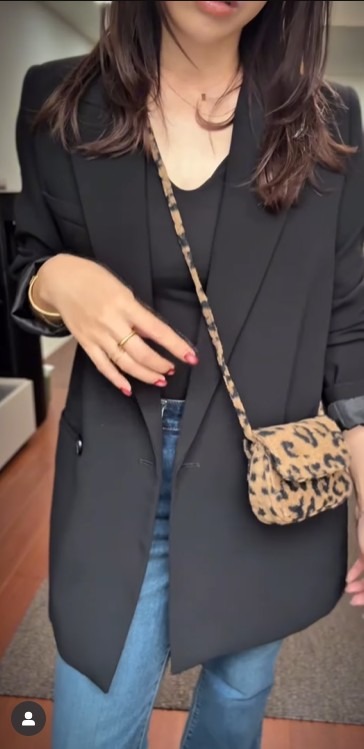 トップスには、ゆったりとしたシルエットの黒のテーラードジャケットを羽織り、インナーにも黒のカットソーを合わせています。全体をダークトーンでまとめることで、カジュアルなデニムスタイルも一気にシックで洗練された印象に