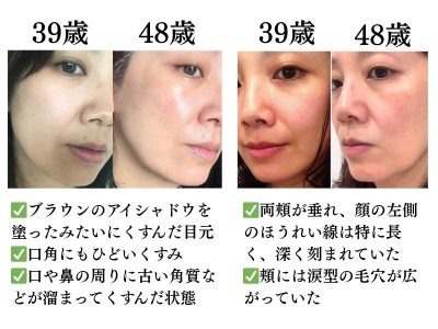 ところが、10年以上前の老け肌だった頃は、頬いっぱいに広がるたるみ毛穴と目元と口元のひどいくすみ、肌のゴワつき、ほうれい線、フェイスラインのゆるみに、毎月生理前にできる吹き出物にも悩んでいました。
