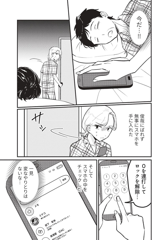 まさか夫が犯人…? ミヤコが夫のスマホを探ると、夫の「パパ活」が判明する。