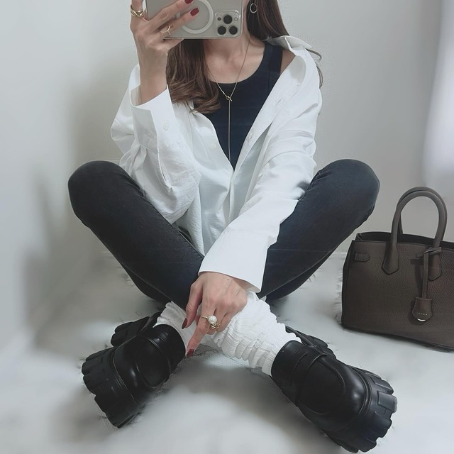 足元はボリューム感のある黒のローファーと白ソックスを合わせることで、旬なバランスに。モノトーンでまとめることで、カジュアルなドルマンシャツをきれいめな印象に格上げしています。