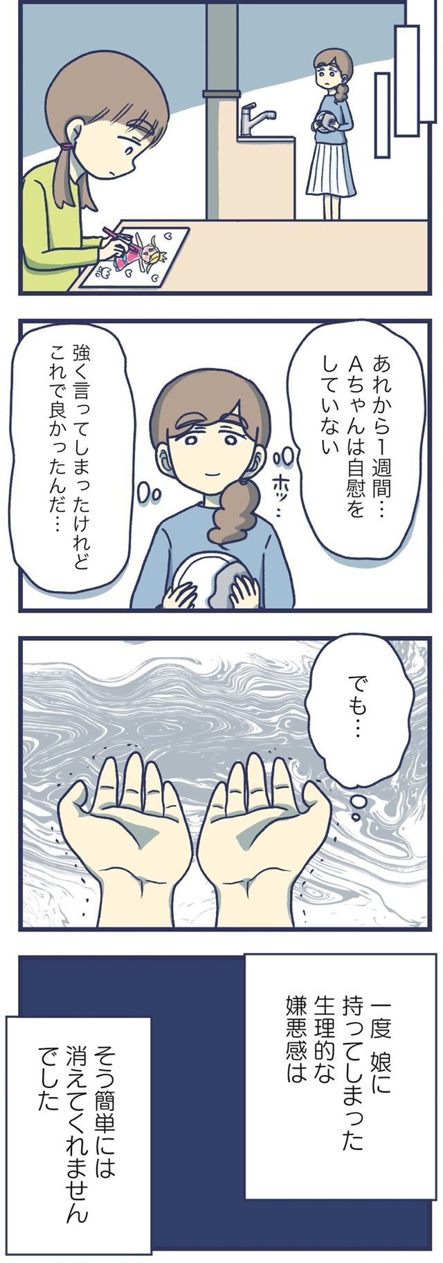 2人目を出産後、甘えてくるようになった4歳の長女。そんなある日、長女が自慰行為にふけっている現場を見てしまい、主人公は大きな衝撃を受けます。ネットで調べても「よくあること」「見守ってあげましょう」という言説ばかりで、母親の葛藤に寄り添うようなものは見当たりません。「娘が気持ち悪い」そう思ってしまう自分に苦しむ日々のなかで、徐々に追い詰められて……。今回は、幼すぎる性の目覚めに葛藤する母娘の苦しみを鮮烈に描いたコミックエッセイを特別抜粋でお届けします。
