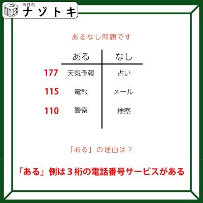 「ある」側にあるのは「天気予報」「電報」「警察」そしてヒントで追加されたものは「時報」と「電話の故障」です。これらをみてピンとくることはないでしょうか?