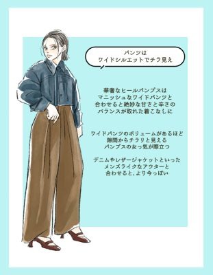 とくにタイトなシルエットではなくストレートに近いセミワイドパンツが良いですね。できれば、つるんとした質感のスラックスでモード感を与えましょう。ワイドパンツというクールでかっこいいボトムスから、細いヒールにつま先の尖ったパンプスが少しだけ見える。このアンバランスさがおしゃれな印象を与えます。