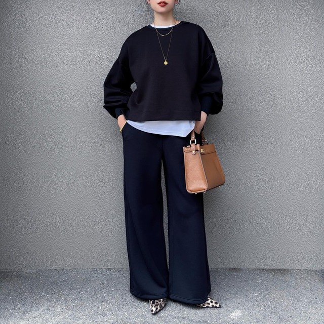 全体をダークトーンで統一することで、カジュアルなスウェットも大人っぽい印象にまとまっています。特に、パフスウェットバギーパンツは、きれいめなデザインが魅力。また、インナーに白のシャツをレイヤードし、裾からちら見せすることで、着こなしに奥行きと軽さが加わっています。レオパード柄のパンプスや、キャメルのバッグなど、小物でメリハリをつけているのもさすがのテクニックです。