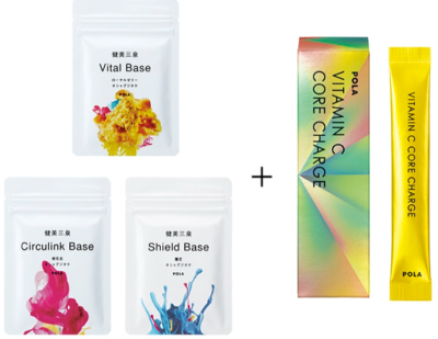 『健美三泉』とは、健やかな美しさを追求し、その土台となるからだとこころを磨く、東洋思想に基づいた健康食品シリーズです。日本ではほぼ流通していない「オシャクジタケ」のエキスを共通成分として配合、バイタル/サーキュリンク/シールドの3種類のベースを組み合わせて取り入れる、長年のポーラファンの皆さんに人気を誇るシリーズ。3カ月分がセットになった通常の『健美三泉 コンプリートベース』と同じプライスで『ビタミンC コア チャージ』を試せる耳よりな機会です。数量限定ですので、気になる方はお早めに!