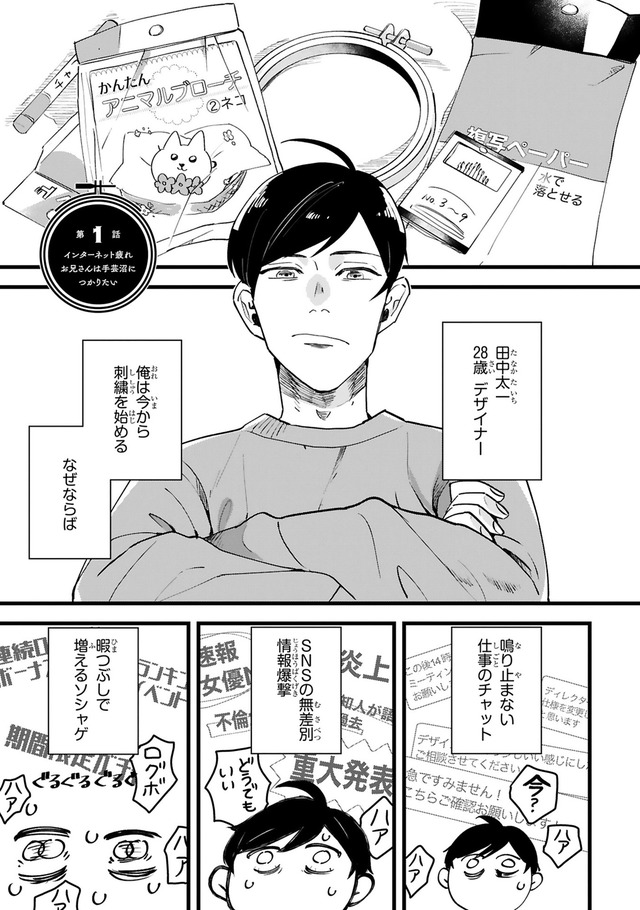 SNSや終わらない仕事に疲れ切ったサラリーマン・田中。無の心を求め刺繍を始めるも不器用で図柄はぐちゃぐちゃ。