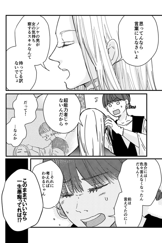 美容師のはるか(33)は、付き合って3年経つ彼氏の浩介(30)に、『結婚したい!』をはじめ、些細なことも口に出さずに言えない、モヤモヤを抱える日々を送っていた。