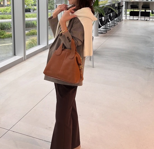 特に注目なのは、白のユニクロ「カシミヤタッチクルーネックセーター」の肩掛けテクニックです。この着こなしは、寒くなったらインナーに、いまの季節なら肩掛けに、と着回しが効くテクニック。このニットのやわらかい素材感が、ジャケットの堅さを和らげ、きれいめなブラウンパンツと相まって、大人のやさしい雰囲気を醸し出しています。茶系のワントーンに白を効かせることで、清潔感と抜け感のある洗練された印象に仕上がっています。
