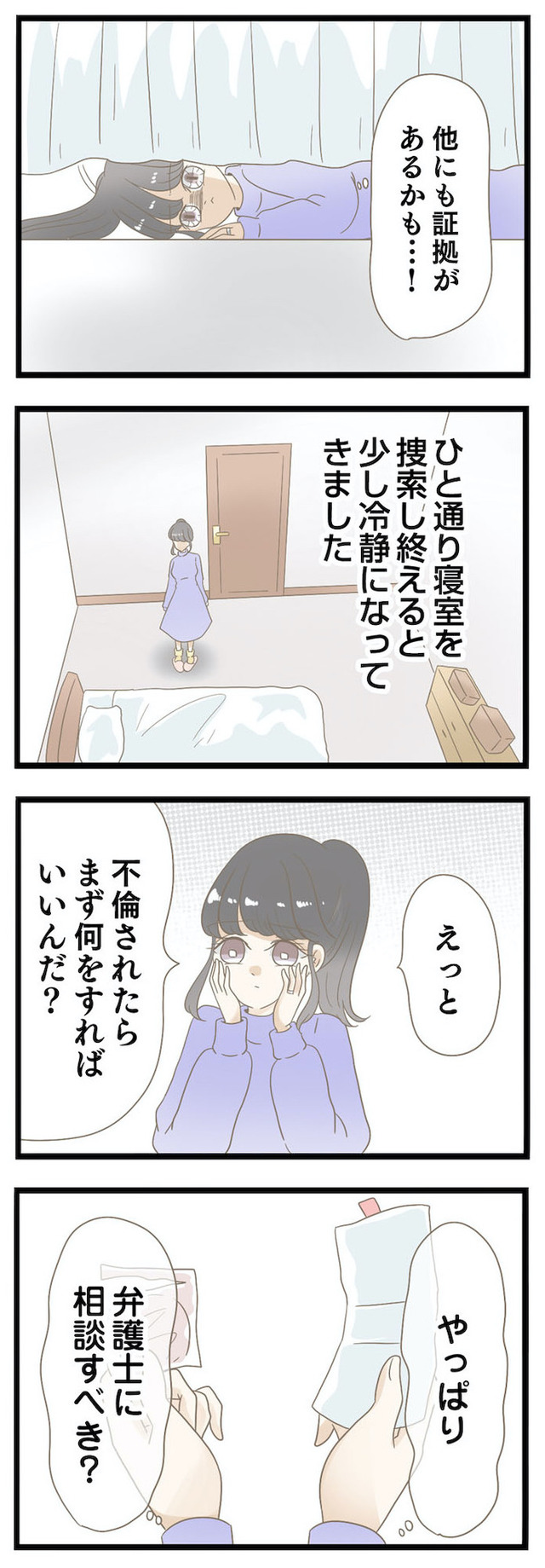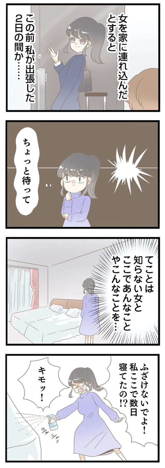 出張に行く夫を見送った後、新居のベッドルームで夫の不倫の証拠を見つけてしまう。