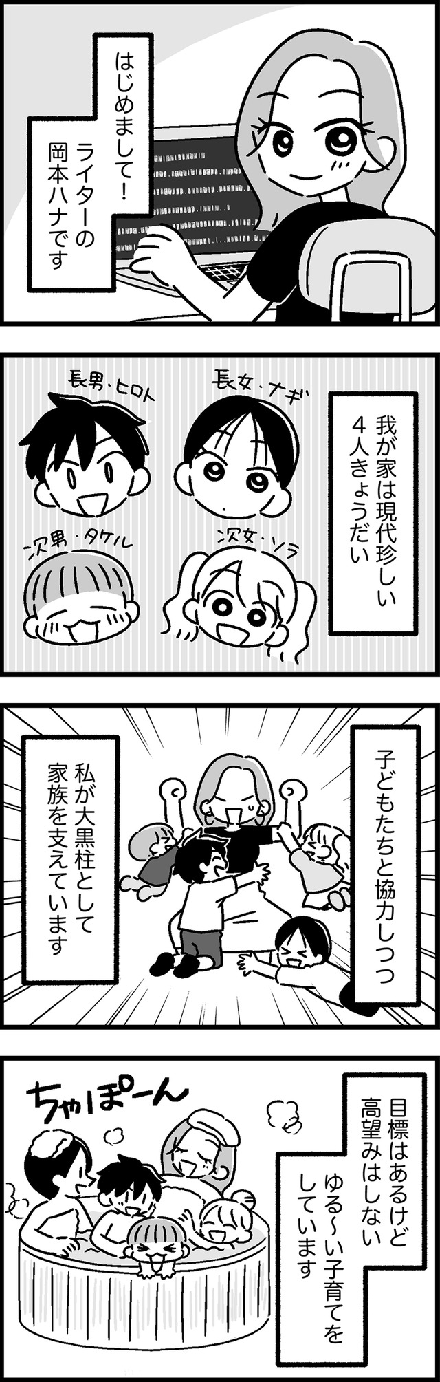 東京で4人の子どもと暮らしているライター・岡本ハナさん。長女はADHDと強迫性障害を併せ持っています。目標はあるけど高望みはしない…と、自分の目と手が届く範囲で奮闘する毎日をオトナサローネで連載中。発達障害児とそのきょうだいを育てるなかで、うれしいこと、つらいこと、悲しいことを赤裸々につづっています。人気連載をマンガ化!